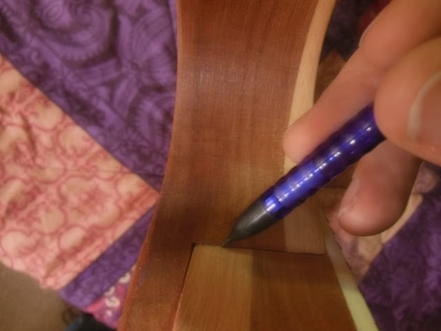 Properly lined up - now I make a light pencil mark on each side of the neck to make aligning after gluing easier.