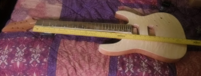 The neck is a nice, snug fit so I got it close and then tapped it into position using a hammer and a block of wood to get proper alignment. 25" on the money - that will allow for saddle adjustments either way for intonation.